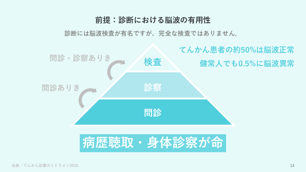 #15. 前提:診断における脳波の有用性 診断には脳波検査が有名ですが,完全な検査ではありません. 出典:てんかん診療ガイドライン2018 14 問診ありき 問診・診察ありき てんかん患者の約50%は脳波正常