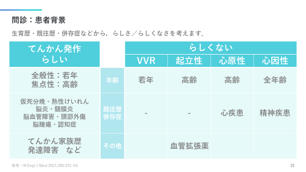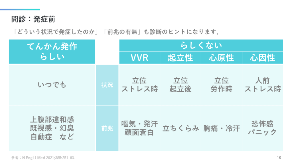 #17. 問診:発症前 「どういう状況で発症したのか」「前兆の有無」も診断のヒントになります. 参考:N Engl J Med 2021;385:251-63. 16