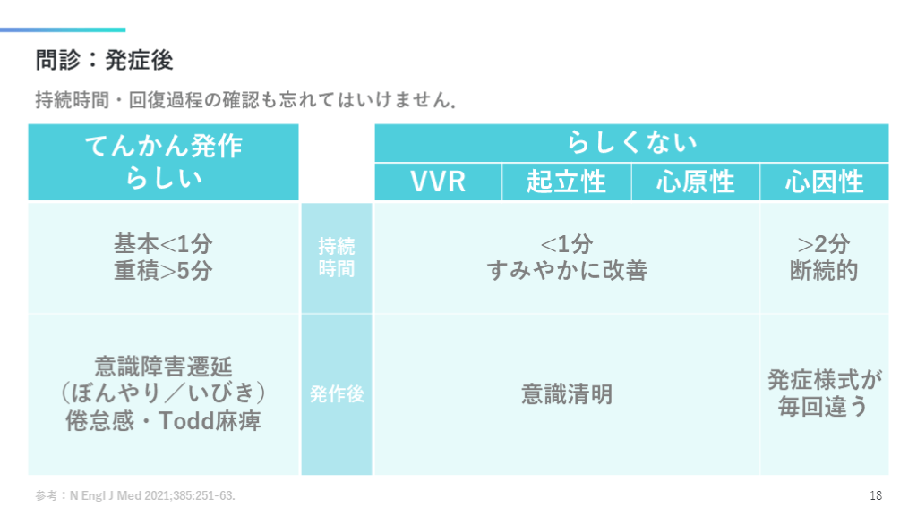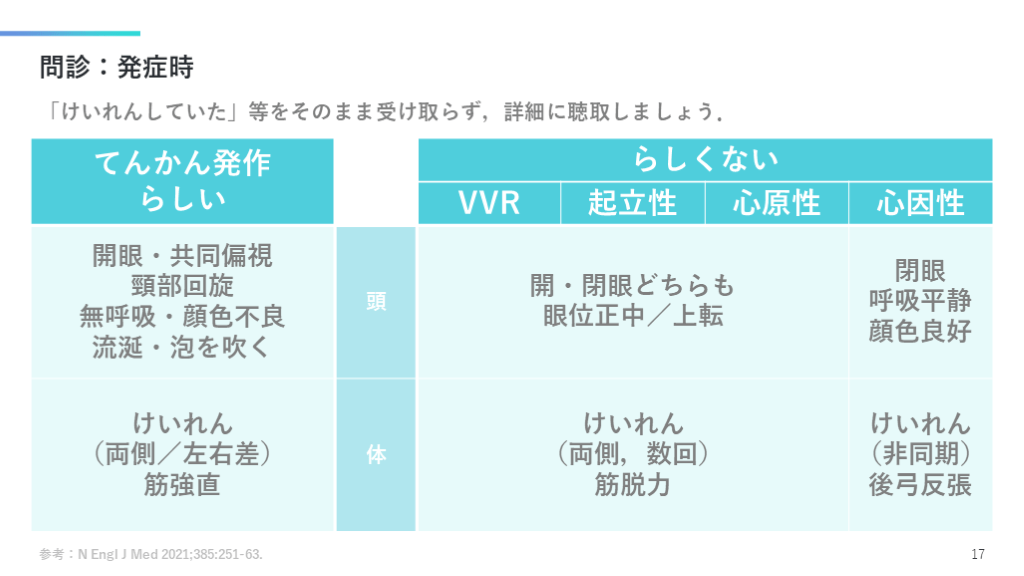 #18. 問診:発症時 「けいれんしていた」等をそのまま受け取らず,詳細に聴取しましょう. 参考:N Engl J Med 2021;385:251-63. 17