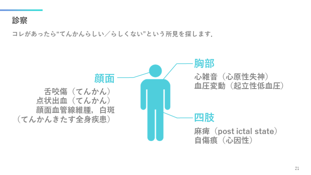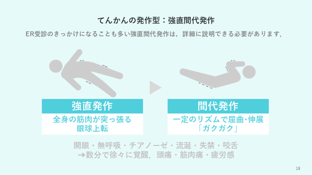 #20. てんかんの発作型:強直間代発作 ER受診のきっかけになることも多い強直間代発作は,詳細に説明できる必要があります. 19 開眼・無呼吸・チアノーゼ・流涎・失禁・咬舌