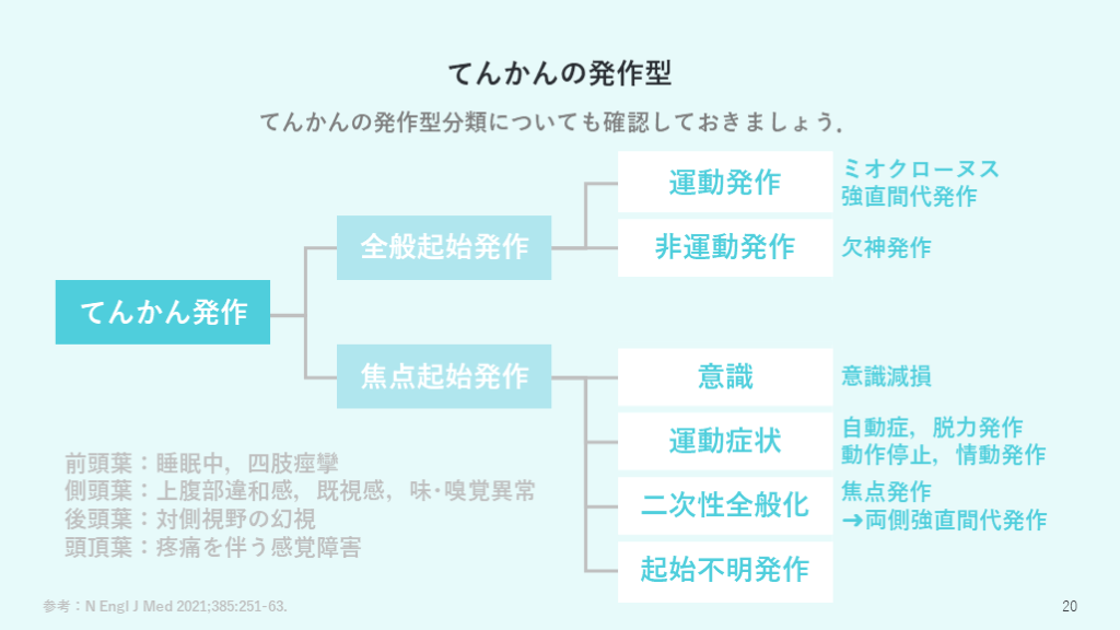 #21. てんかんの発作型 てんかんの発作型分類についても確認しておきましょう. 参考:N Engl J Med 2021;385:251-63. 20