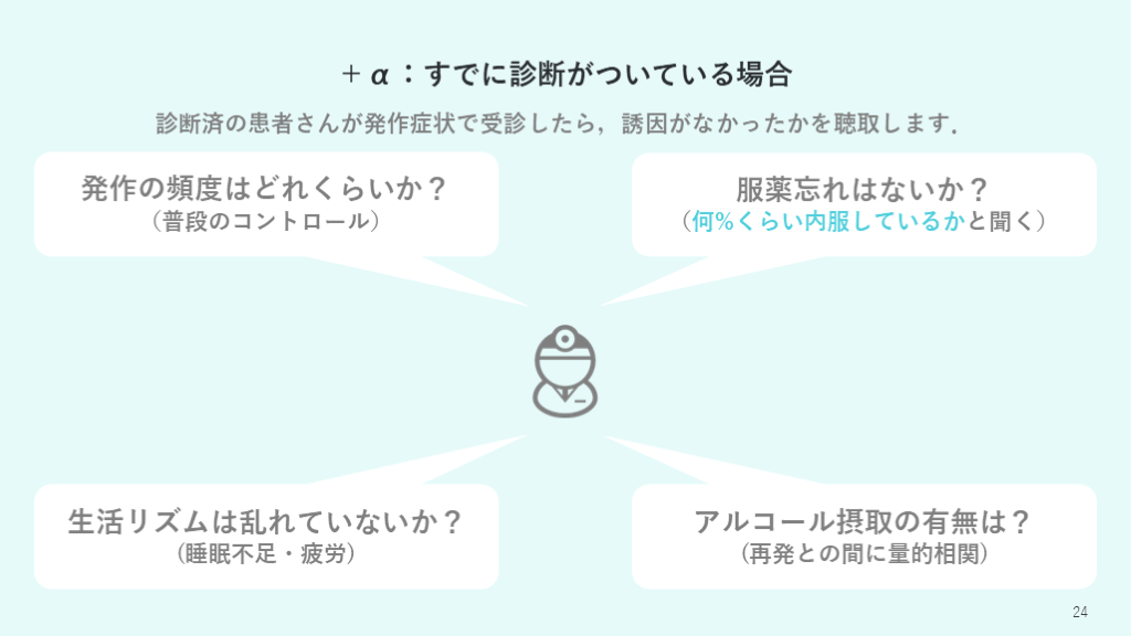 (睡眠不足・疲労) +α:すでに診断がついている場合 診断済の患者さんが発作症状で受診したら,誘因がなかったかを聴取します. 24
