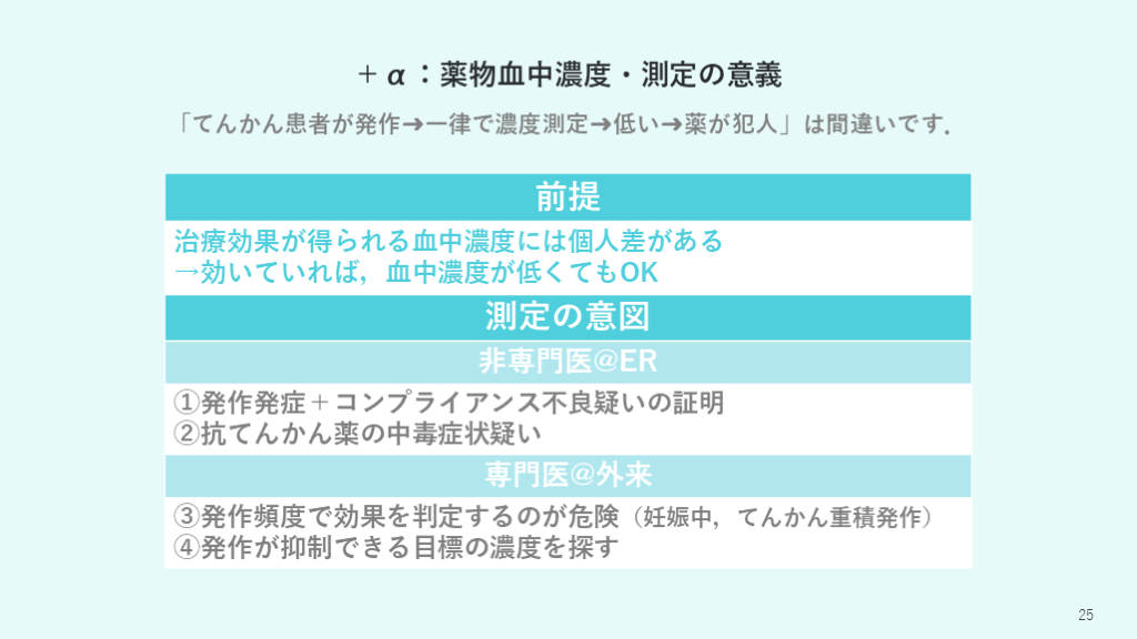 #26. +α:薬物血中濃度・測定の意義 「てんかん患者が発作➜一律で濃度測定➜低い➜薬が犯人」は間違いです. 25