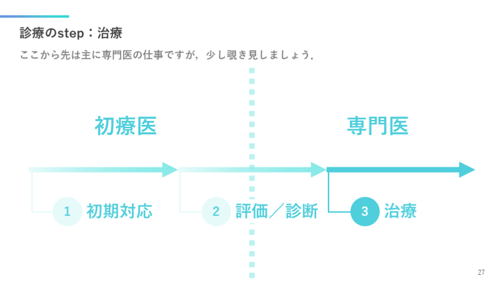 #28. 診療のstep:治療 ここから先は主に専門医の仕事ですが,少し覗き見しましょう. 27 初期対応 評価/診断 治療 初療医 専門医 1 2 3