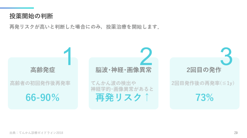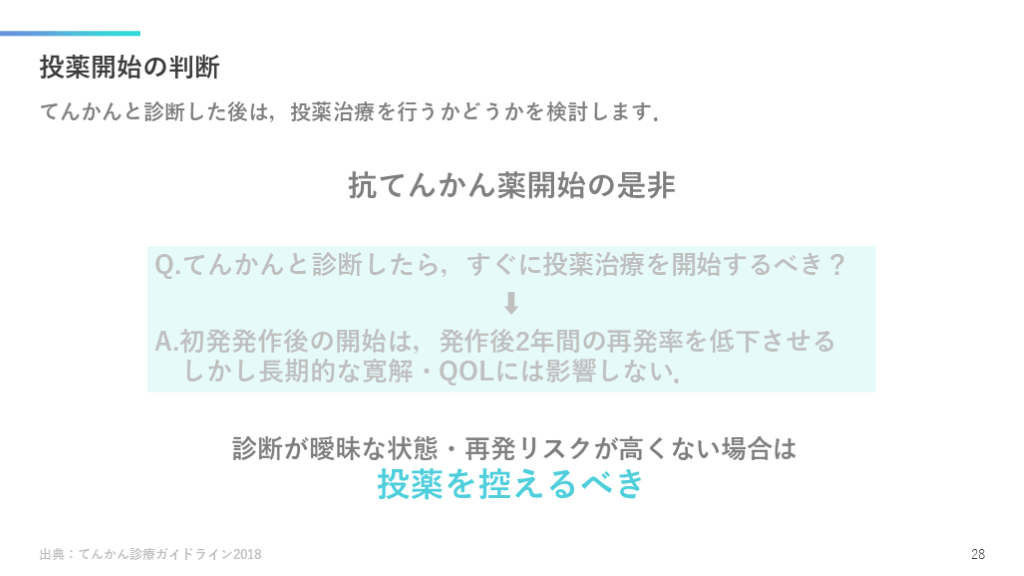 #29. 投薬開始の判断 てんかんと診断した後は,投薬治療を行うかどうかを検討します. 出典:てんかん診療ガイドライン2018 28