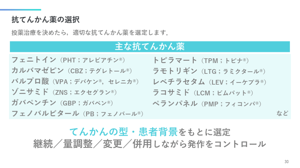 #31. 抗てんかん薬の選択 投薬治療を決めたら,適切な抗てんかん薬を選定します. 30 てんかんの型・患者背景をもとに選定