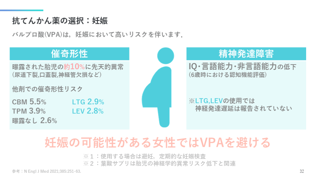 #33. 抗てんかん薬の選択:妊娠 バルプロ酸(VPA)は,妊娠において高いリスクを伴います. 参考:N Engl J Med 2021;385:251-63. 32 妊娠の可能性がある女性ではVPAを避ける ※1:使用する場合は避妊,定期的な妊娠検査