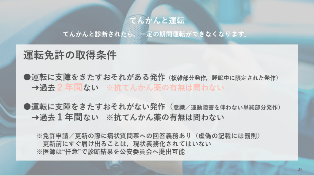 #35. てんかんと運転 てんかんと診断されたら,一定の期間運転ができなくなります. 34 ●運転に支障をきたすおそれがある発作(複雑部分発作,睡眠中に限定された発作)