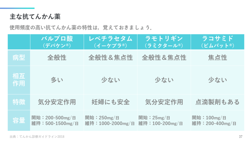 #38. 主な抗てんかん薬 使用頻度の高い抗てんかん薬の特性は,覚えておきましょう. 出典:てんかん診療ガイドライン2018 37