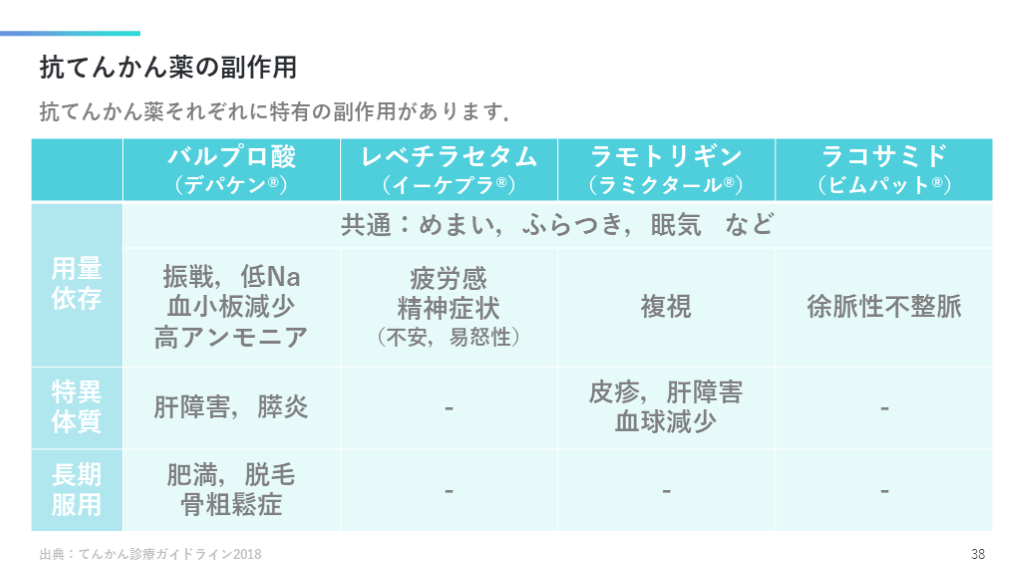#39. 抗てんかん薬の副作用 抗てんかん薬それぞれに特有の副作用があります. 出典:てんかん診療ガイドライン2018 38