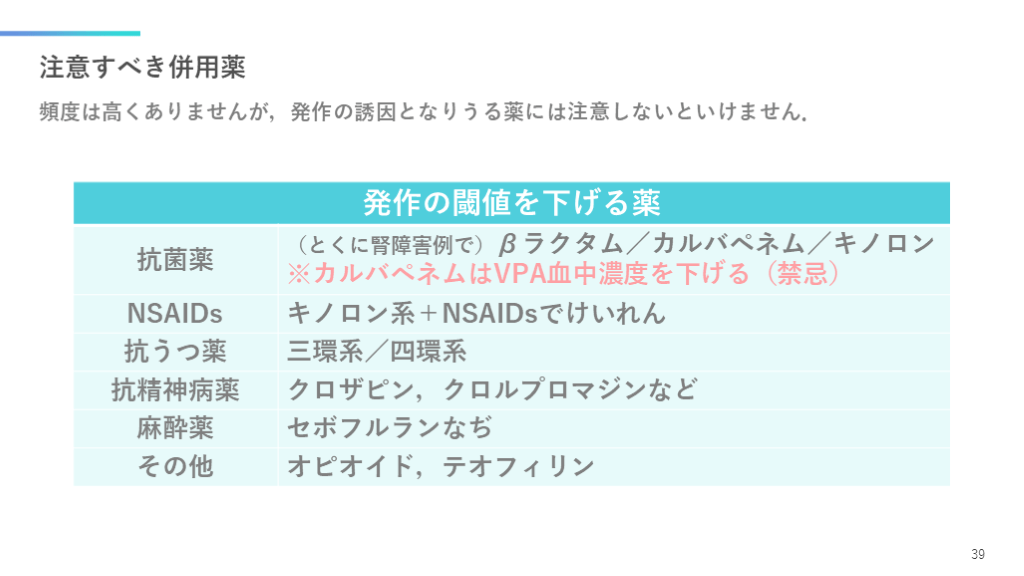 #40. 注意すべき併用薬 頻度は高くありませんが,発作の誘因となりうる薬には注意しないといけません. 39