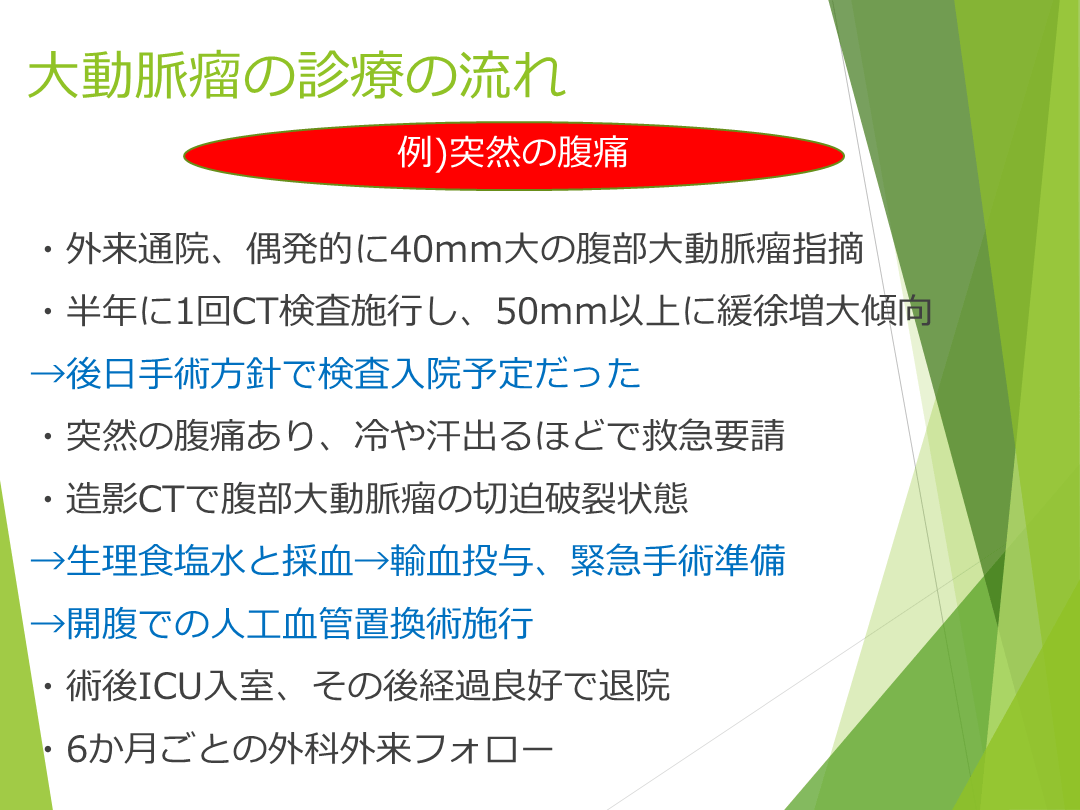 #14. 大動脈瘤の診療の流れ ・外来通院、偶発的に40mm大の腹部大動脈瘤指摘