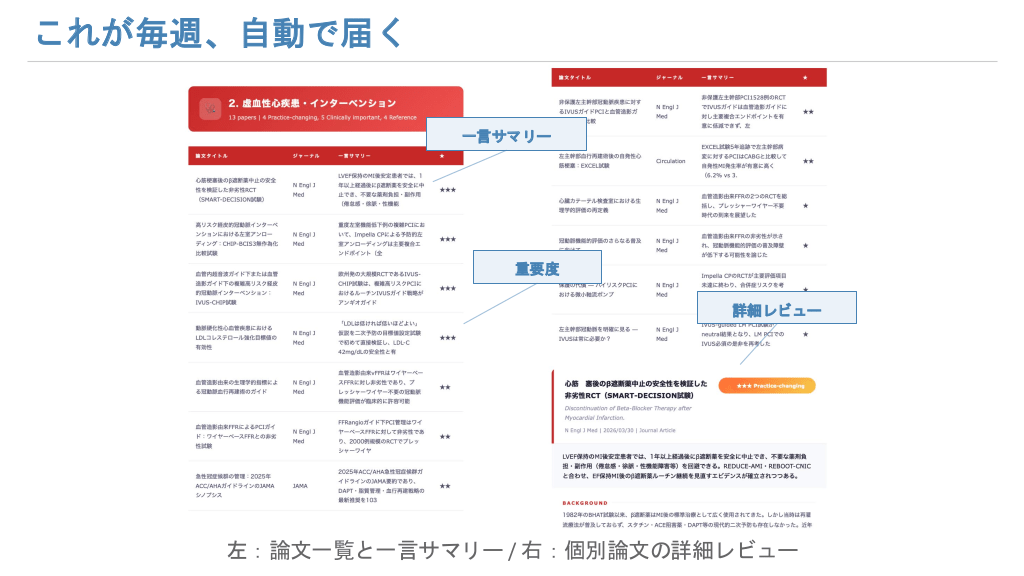 #10. これが毎週、自動で届く 一言サマリー 重要度 詳細レビュー 左:論文一覧と一言サマリー / 右:個別論文の詳細レビュー