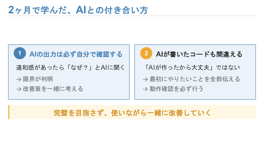 #11. 2ヶ月で学んだ、AIとの付き合い方 1 AIの出力は必ず自分で確認する 2 AIが書いたコードも間違える 違和感があったら「なぜ?」とAIに聞く 「AIが作ったから大丈夫」ではない → 限界が判明 → 最初にやりたいことを全部伝える → 改善策を一緒に考える → 動作確認を必ず行う 完璧を目指さず、使いながら一緒に改善していく