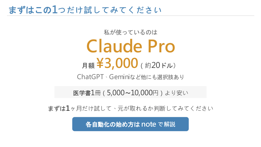 #12. まずはこの1つだけ試してみてください 私が使っているのは Claude Pro 月額 ¥3,000(約20ドル) ChatGPT、Geminiなど他にも選択肢あり 医学書1冊(5,000〜10,000円)より安い まずは1ヶ月だけ試して、元が取れるか判断してみてください 各自動化の始め方は note で解説
