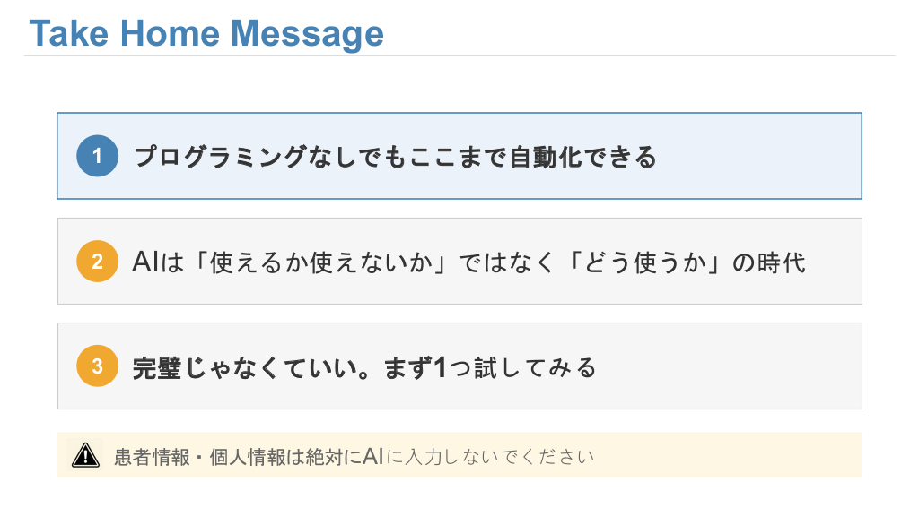 #13. Take Home Message 1 プログラミングなしでもここまで自動化できる 2 AIは「使えるか使えないか」ではなく「どう使うか」の時代 3 完璧じゃなくていい。まず1つ試してみる 患者情報・個人情報は絶対にAIに入力しないでください