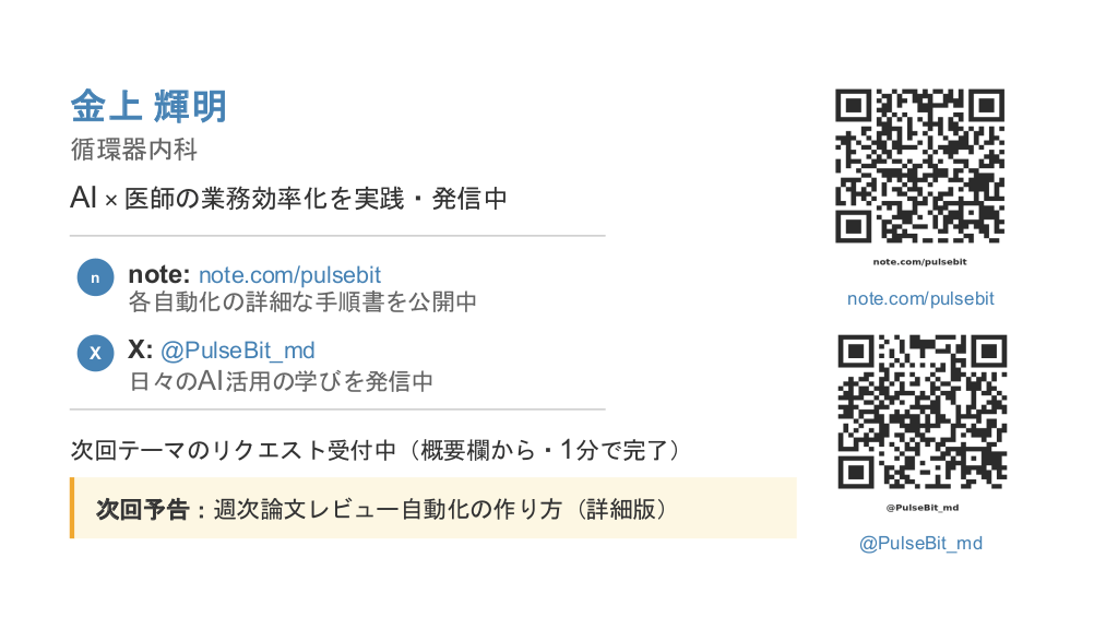 #14. 金上 輝明 循環器内科 AI × 医師の業務効率化を実践・発信中 n note: note.com/pulsebit 各自動化の詳細な手順書を公開中 X note.com/pulsebit X: @PulseBit_md 日々のAI活用の学びを発信中 次回テーマのリクエスト受付中(概要欄から・1 分で完了) 次回予告:週次論文レビュー自動化の作り方(詳細版) @PulseBit_md