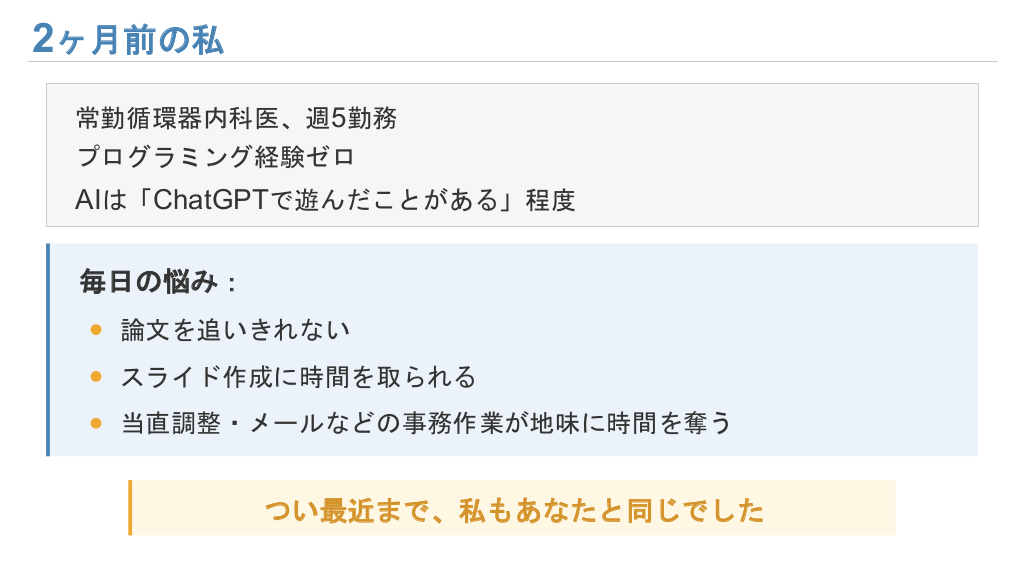 #2. 2ヶ月前の私 常勤循環器内科医、週5 勤務 プログラミング経験ゼロ AIは「ChatGPTで遊んだことがある」程度 毎日の悩み: 論文を追いきれない スライド作成に時間を取られる 当直調整・メールなどの事務作業が地味に時間を奪う つい最近まで、私もあなたと同じでした