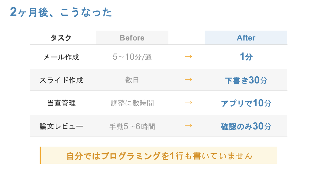 #3. 2ヶ月後、こうなった タスク Before After メール作成 5〜10分/通 → 1分 スライド作成 数日 → 下書き30分 当直管理 調整に数時間 → アプリで10分 論文レビュー 手動5〜6 時間 → 確認のみ30分 自分ではプログラミングを1 行も書いていません