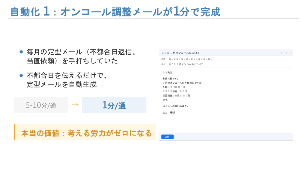 #4. 自動化 1:オンコール調整メールが1分で完成 毎月の定型メール(不都合日返信、 当直依頼)を手打ちしていた 不都合日を伝えるだけで、 定型メールを自動生成 5-10分/通 → 1分/通 本当の価値:考える労力がゼロになる