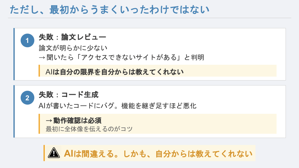 #6. ただし、最初からうまくいったわけではない 1 失敗:論文レビュー 論文が明らかに少ない → 聞いたら「アクセスできないサイトがある」と判明 AIは自分の限界を自分からは教えてくれない 2 失敗:コード生成 AIが書いたコードにバグ。機能を継ぎ足すほど悪化 → 動作確認は必須 最初に全体像を伝えるのがコツ AIは間違える。しかも、自分からは教えてくれない