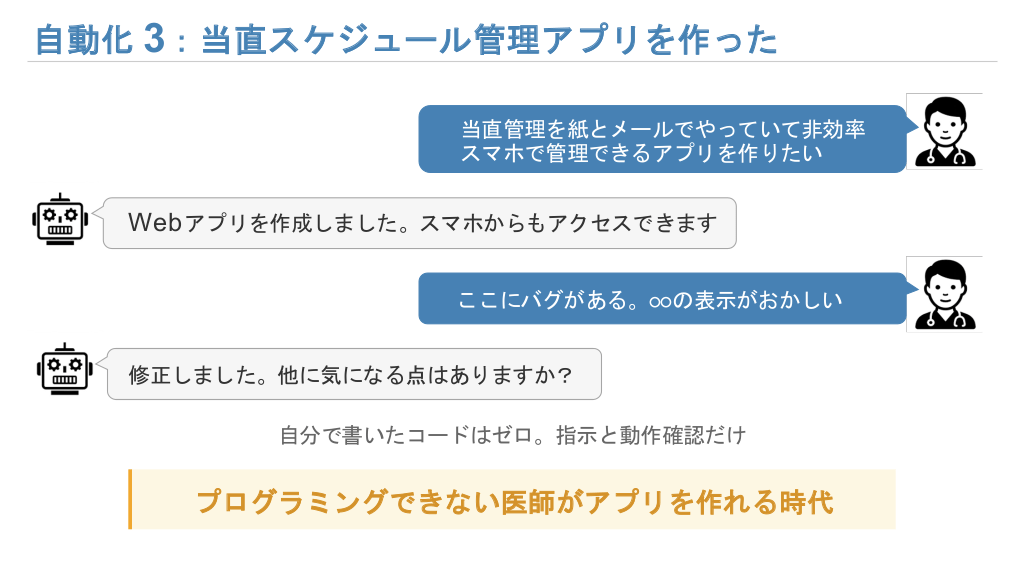 #7. 自動化 3:当直スケジュール管理アプリを作った 当直管理を紙とメールでやっていて非効率 スマホで管理できるアプリを作りたい Web アプリを作成しました。スマホからもアクセスできます ここにバグがある。○○の表示がおかしい 修正しました。他に気になる点はありますか? 自分で書いたコードはゼロ。指示と動作確認だけ プログラミングできない医師がアプリを作れる時代