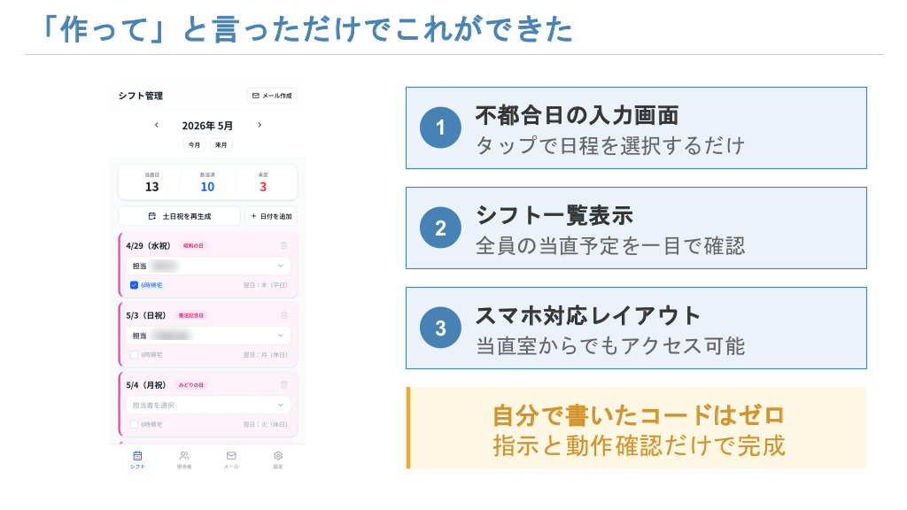 #8. 「作って」と言っただけでこれができた 1 2 3 不都合日の入力画面 タップで日程を選択するだけ シフト一覧表示 全員の当直予定を一目で確認 スマホ対応レイアウト 当直室からでもアクセス可能 自分で書いたコードはゼロ 指示と動作確認だけで完成
