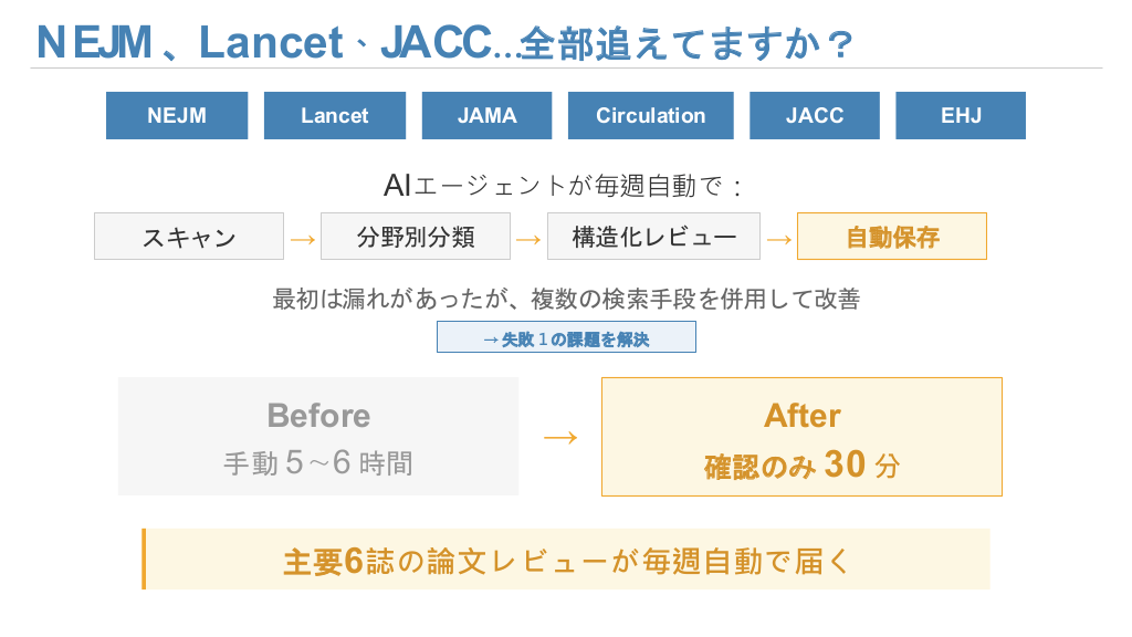 #9. NEJM 、Lancet、JACC…全部追えてますか? NEJM Lancet JAMA Circulation JACC EHJ AIエージェントが毎週自動で: スキャン → 分野別分類 → 構造化レビュー → 自動保存 最初は漏れがあったが、複数の検索手段を併用して改善 → 失敗 1 の課題を解決 Before 手動 5〜6 時間 → After 確認のみ 30 分 主要6 誌の論文レビューが毎週自動で届く