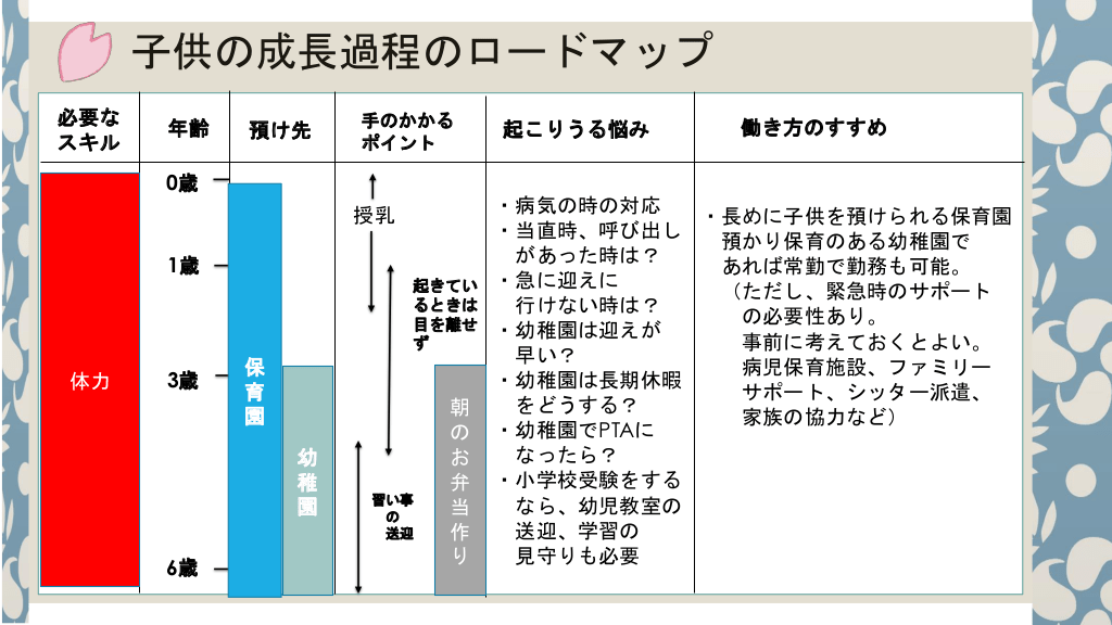 #10. 子供の成長過程のロードマップ 必要な スキル 年齢 預け先 手のかかる ポイント 起こりうる悩み 働き方のすすめ 0歳 授乳 1歳 起きてい るときは 目を離せ ず 体 力 体力 3歳 保 育 園 幼 稚 園 6歳 習い事 の 送迎 朝 の お 弁 当 作 り ・病気の時の対応 ・長めに子供を預けられる保育園 ・当直時、呼び出し 預かり保育のある幼稚園で があった時は? あれば常勤で勤務も可能。 ・急に迎えに (ただし、緊急時のサポート 行けない時は? の必要性あり。 ・幼稚園は迎えが 事前に考えておくとよい。 早い? 病児保育施設、ファミリー ・幼稚園は長期休暇 サポート、シッター派遣、 をどうする? 家族の協力など) ・幼稚園でPTAに なったら? ・小学校受験をする なら、幼児教室の 送迎、学習の 見守りも必要