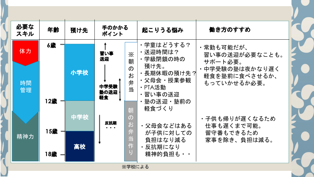 #11. 必要な スキル 体 体力 年齢 預け先 手のかかる ポイント 6歳 習い事 送迎 力 小学校 時間 管理 中学受験 塾の送迎・ 軽食 12歳 中学校 精神力 反抗期 ・・・ 15歳 高校 18歳 ※ 朝 の お 弁 当 起こりうる悩み 働き方のすすめ ・学童はどうする? ・常勤も可能だが、 ・送迎時間は? 習い事の送迎が必要なことも。 ・学級閉鎖の時の サポート必要。 預け先。 ・中学受験の塾は夜かなり遅く ・長期休暇の預け先? 軽食を塾前に食べさせるか、 ・父母会・授業参観 もっていかせるか必要。 ・PTA活動 ・習い事の送迎 ・塾の送迎・塾前の 軽食づくり 朝 の お ・父母会などはある 弁 が子供に対しての 当 負担はなり減る 作 ・反抗期になり り 精神的負担も・・ ※学校による ・子供も帰りが遅くなるため 仕事も遅くまで可能。 留守番もできるため 家事を除き、負担は減る。