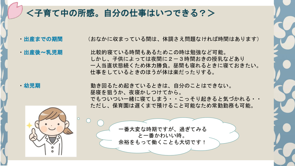 #12. <子育て中の所感。自分の仕事はいつできる?> ・出産までの期間 (おなかに収まっている間は、体調さえ問題なければ時間はあります) ・出産後~乳児期 比較的寝ている時間もあるためこの時は勉強など可能。 しかし、子供によっては夜間に2-3時間おきの授乳などあり 一人当直状態続くため体力勝負。昼間も寝れるときに寝ておきたい。 仕事をしているときのほうが体は楽だったりする。 ・幼児期 動き回るため起きているときは、自分のことはできない。 昼寝を狙うか、夜寝かしつけてから。 でもついつい一緒に寝てしまう・・こっそり起きると気づかれる・・ ただし、保育園は遅くまで預けること可能なため常勤勤務も可能。 一番大変な時期ですが、過ぎてみる と一番かわいい時。 余裕をもって働くことも大切です!