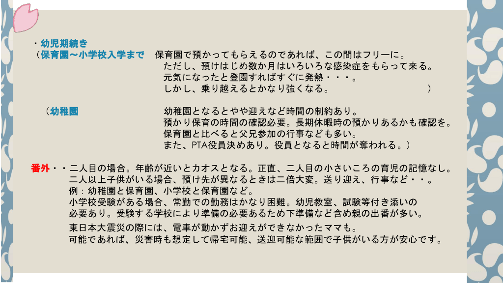 #13. ・幼児期続き (保育園~小学校入学まで (幼稚園 保育園で預かってもらえるのであれば、この間はフリーに。 ただし、預けはじめ数か月はいろいろな感染症をもらって来る。 元気になったと登園すればすぐに発熱・・・。 しかし、乗り越えるとかなり強くなる。 ) 幼稚園となるとやや迎えなど時間の制約あり。 預かり保育の時間の確認必要。長期休暇時の預かりあるかも確認を。 保育園と比べると父兄参加の行事なども多い。 また、PTA役員決めあり。役員となると時間が奪われる。) 番外・・二人目の場合。年齢が近いとカオスとなる。正直、二人目の小さいころの育児の記憶なし。 二人以上子供がいる場合、預け先が異なるときは二倍大変。送り迎え、行事など・・。 例:幼稚園と保育園、小学校と保育園など。 小学校受験がある場合、常勤での勤務はかなり困難。幼児教室、試験等付き添いの 必要あり。受験する学校により準備の必要あるため下準備など含め親の出番が多い。 東日本大震災の際には、電車が動かずお迎えができなかったママも。 可能であれば、災害時も想定して帰宅可能、送迎可能な範囲で子供がいる方が安心です。