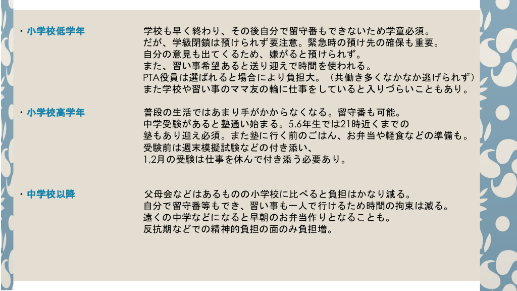 #14. ・小学校低学年 学校も早く終わり、その後自分で留守番もできないため学童必須。 だが、学級閉鎖は預けられず要注意。緊急時の預け先の確保も重要。 自分の意見も出てくるため、嫌がると預けられず。 また、習い事希望あると送り迎えで時間を使われる。 PTA役員は選ばれると場合により負担大。(共働き多くなかなか逃げられず) また学校や習い事のママ友の輪に仕事をしていると入りづらいこともあり。 ・小学校高学年 普段の生活ではあまり手がかからなくなる。留守番も可能。 中学受験があると塾通い始まる。5.6年生では21時近くまでの 塾もあり迎え必須。また塾に行く前のごはん、お弁当や軽食などの準備も。 受験前は週末模擬試験などの付き添い、 1,2月の受験は仕事を休んで付き添う必要あり。 ・中学校以降 父母会などはあるものの小学校に比べると負担はかなり減る。 自分で留守番等もでき、習い事も一人で行けるため時間の拘束は減る。 遠くの中学などになると早朝のお弁当作りとなることも。 反抗期などでの精神的負担の面のみ負担増。