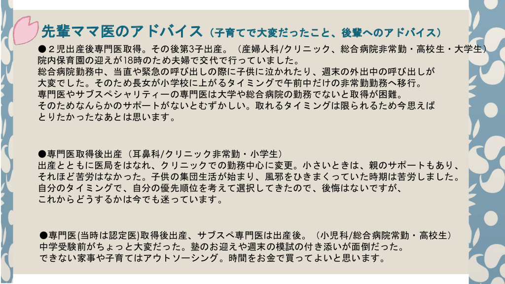 #15. 先輩ママ医のアドバイス(子育てで大変だったこと、後輩へのアドバイス) ●2児出産後専門医取得。その後第3子出産。(産婦人科/クリニック、総合病院非常勤・高校生・大学生) 院内保育園の迎えが18時のため夫婦で交代で行っていました。 総合病院勤務中、当直や緊急の呼び出しの際に子供に泣かれたり、週末の外出中の呼び出しが 大変でした。そのため長女が小学校に上がるタイミングで午前中だけの非常勤勤務へ移行。 専門医やサブスぺシャリティーの専門医は大学や総合病院の勤務でないと取得が困難。 そのためなんらかのサポートがないとむずかしい。取れるタイミングは限られるため今思えば とりたかったなあとは思います。 ●専門医取得後出産(耳鼻科/クリニック非常勤・小学生) 出産とともに医局をはなれ、クリニックでの勤務中心に変更。小さいときは、親のサポートもあり、 それほど苦労はなかった。子供の集団生活が始まり、風邪をひきまくっていた時期は苦労しました。 自分のタイミングで、自分の優先順位を考えて選択してきたので、後悔はないですが、 これからどうするかは今でも迷っています。 ●専門医(当時は認定医)取得後出産、サブスぺ専門医は出産後。(小児科/総合病院常勤・高校生) 中学受験前がちょっと大変だった。塾のお迎えや週末の模試の付き添いが面倒だった。 できない家事や子育てはアウトソーシング。時間をお金で買ってよいと思います。