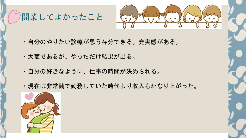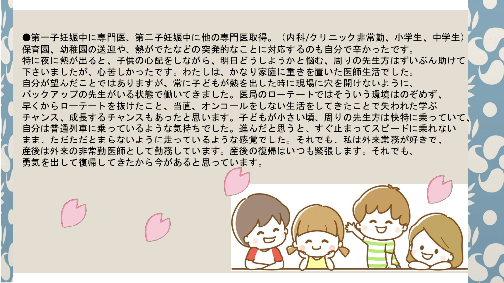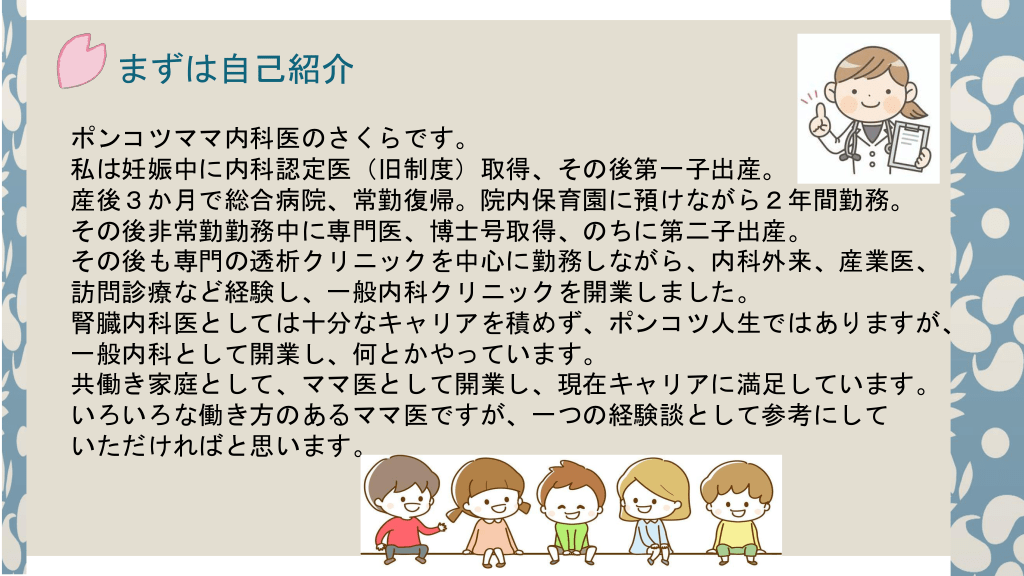 #3. まずは自己紹介 ポンコツママ内科医のさくらです。 私は妊娠中に内科認定医(旧制度)取得、その後第一子出産。 産後3か月で総合病院、常勤復帰。院内保育園に預けながら2年間勤務。 その後非常勤勤務中に専門医、博士号取得、のちに第二子出産。 その後も専門の透析クリニックを中心に勤務しながら、内科外来、産業医、 訪問診療など経験し、一般内科クリニックを開業しました。 腎臓内科医としては十分なキャリアを積めず、ポンコツ人生ではありますが、 一般内科として開業し、何とかやっています。 共働き家庭として、ママ医として開業し、現在キャリアに満足しています。 いろいろな働き方のあるママ医ですが、一つの経験談として参考にして いただければと思います。