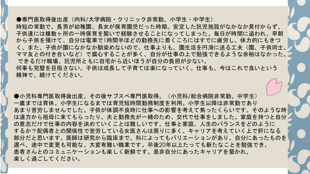 #17. ●専門医取得後出産(内科/大学病院・クリニック非常勤、小学生・中学生) 時短の常勤で、長男が幼稚園、長女が保育園児だった時期。安定した託児施設がなかなか見付からず、 子供達には複数ヶ所の一時保育を繋いで経験させることになってしまった。毎日が時間に追われ、早朝 から子供を預けて、自分は電車で1時間半ほどの勤務先に着くころにはすでに疲労し、体力的にもきつ く、また、子供が園になかなか馴染めないので、仕事よりも、園生活を円滑に送る工夫(園、子供同士、 ママ友との付き合いなど)で腐心することが多く、自分が仕事の上で勉強できるような余裕はなかった。 できるだけ職場、託児所ともに自宅から近いほうが自分の負担が少ない。 何事も完璧を目指さない。子供は成長して子育ては楽になっていく。仕事も、今はこれで良いという 精神で、続けてください。 ●小児科専門医取得後出産、その後サブスぺ専門医取得。(小児科/総合病院非常勤、中学生) 一歳までは育休、小学生になるまでは育児短時間勤務制度を利用。小学生以降は非常勤であり あまり苦労しませんでした。子供が体調不良時に仕事への影響を考えて焦ったくらいです。そのような時 は遠方から祖母に来てもらったり、夫と勤務先が一緒のため、交代で仕事をしました。家庭を持つと自分 の意志だけで仕事の内容を決めていくことは難しいです。仕事と家庭、人生のバランスをどのように するか?配偶者との関係性で苦労している女医さんは周りに多く、キャリアを考えていく上で肝になる 部分だと思います。医師は研究から臨床まで、科によってもバリエーションがあり、自分にあったものを 選べ、途中で変更も可能な、大変有難い職業です。卒後20年以上たっても新たなことを勉強でき、 患者さんとのコミュニケーションも楽しく新鮮です。是非自分にあったキャリアを築かれ、 楽しく過ごしてください。