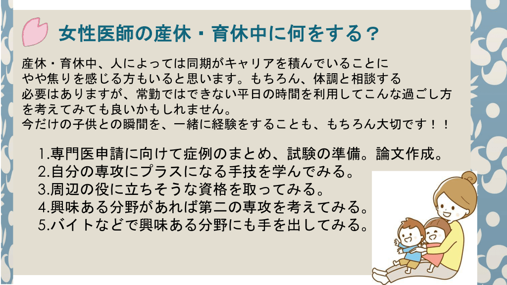 #18. 女性医師の産休・育休中に何をする? 産休・育休中、人によっては同期がキャリアを積んでいることに やや焦りを感じる方もいると思います。もちろん、体調と相談する 必要はありますが、常勤ではできない平日の時間を利用してこんな過ごし方 を考えてみても良いかもしれません。 今だけの子供との瞬間を、一緒に経験をすることも、もちろん大切です!! 1.専門医申請に向けて症例のまとめ、試験の準備。論文作成。 2.自分の専攻にプラスになる手技を学んでみる。 3.周辺の役に立ちそうな資格を取ってみる。 4.興味ある分野があれば第二の専攻を考えてみる。 5.バイトなどで興味ある分野にも手を出してみる。