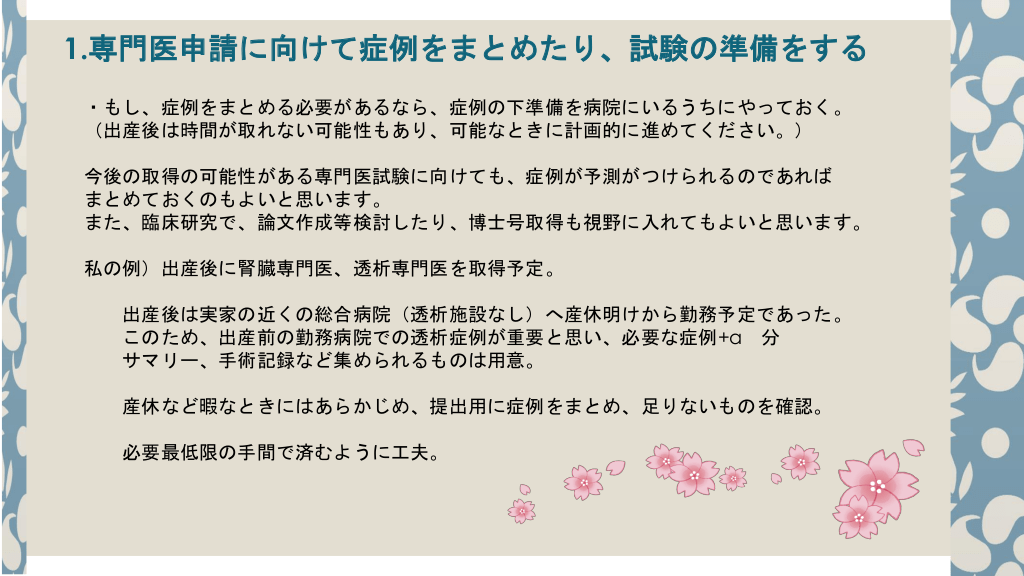 #19. 1.専門医申請に向けて症例をまとめたり、試験の準備をする ・もし、症例をまとめる必要があるなら、症例の下準備を病院にいるうちにやっておく。 (出産後は時間が取れない可能性もあり、可能なときに計画的に進めてください。) 今後の取得の可能性がある専門医試験に向けても、症例が予測がつけられるのであれば まとめておくのもよいと思います。 また、臨床研究で、論文作成等検討したり、博士号取得も視野に入れてもよいと思います。 私の例)出産後に腎臓専門医、透析専門医を取得予定。 出産後は実家の近くの総合病院(透析施設なし)へ産休明けから勤務予定であった。 このため、出産前の勤務病院での透析症例が重要と思い、必要な症例+α 分 サマリー、手術記録など集められるものは用意。 産休など暇なときにはあらかじめ、提出用に症例をまとめ、足りないものを確認。 必要最低限の手間で済むように工夫。