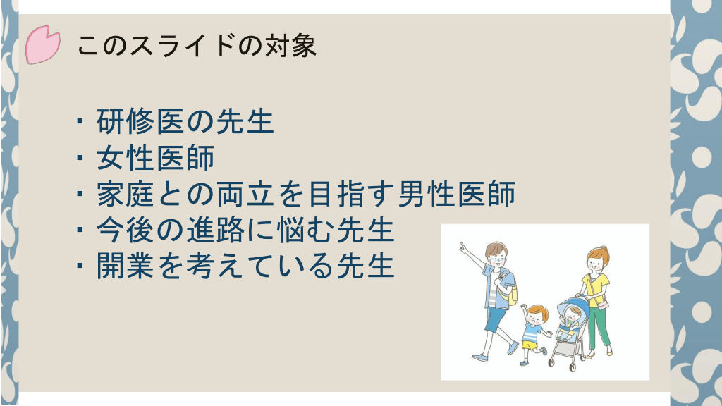 #2. このスライドの対象 ・研修医の先生 ・女性医師 ・家庭との両立を目指す男性医師 ・今後の進路に悩む先生 ・開業を考えている先生