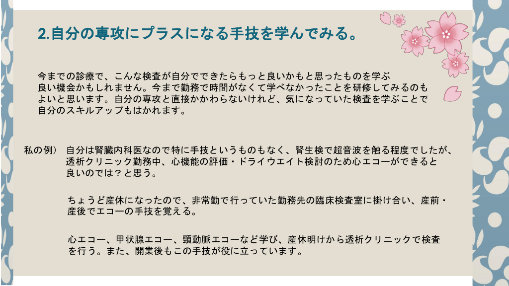 #20. 2.自分の専攻にプラスになる手技を学んでみる。 今までの診療で、こんな検査が自分でできたらもっと良いかもと思ったものを学ぶ 良い機会かもしれません。今まで勤務で時間がなくて学べなかったことを研修してみるのも よいと思います。自分の専攻と直接かかわらないけれど、気になっていた検査を学ぶことで 自分のスキルアップもはかれます。 私の例) 自分は腎臓内科医なので特に手技というものもなく、腎生検で超音波を触る程度でしたが、 透析クリニック勤務中、心機能の評価・ドライウエイト検討のため心エコーができると 良いのでは?と思う。 ちょうど産休になったので、非常勤で行っていた勤務先の臨床検査室に掛け合い、産前・ 産後でエコーの手技を覚える。 心エコー、甲状腺エコー、頸動脈エコーなど学び、産休明けから透析クリニックで検査 を行う。また、開業後もこの手技が役に立っています。