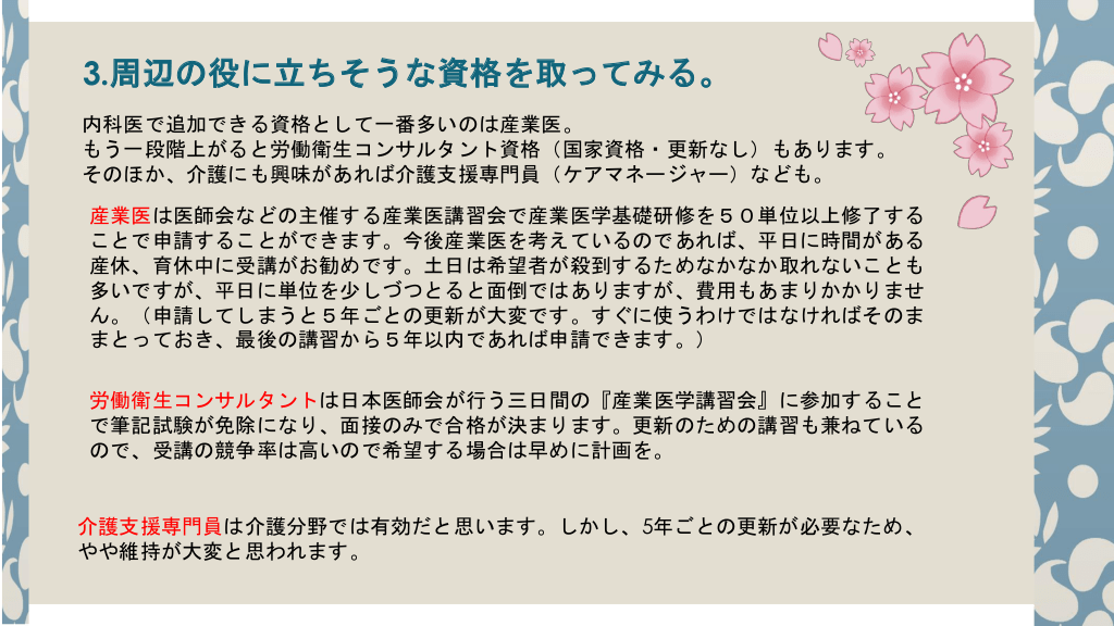 #21. 3.周辺の役に立ちそうな資格を取ってみる。 内科医で追加できる資格として一番多いのは産業医。 もう一段階上がると労働衛生コンサルタント資格(国家資格・更新なし)もあります。 そのほか、介護にも興味があれば介護支援専門員(ケアマネージャー)なども。 産業医は医師会などの主催する産業医講習会で産業医学基礎研修を50単位以上修了する ことで申請することができます。今後産業医を考えているのであれば、平日に時間がある 産休、育休中に受講がお勧めです。土日は希望者が殺到するためなかなか取れないことも 多いですが、平日に単位を少しづつとると面倒ではありますが、費用もあまりかかりませ ん。(申請してしまうと5年ごとの更新が大変です。すぐに使うわけではなければそのま まとっておき、最後の講習から5年以内であれば申請できます。) 労働衛生コンサルタントは日本医師会が行う三日間の『産業医学講習会』に参加すること で筆記試験が免除になり、面接のみで合格が決まります。更新のための講習も兼ねている ので、受講の競争率は高いので希望する場合は早めに計画を。 介護支援専門員は介護分野では有効だと思います。しかし、5年ごとの更新が必要なため、 やや維持が大変と思われます。