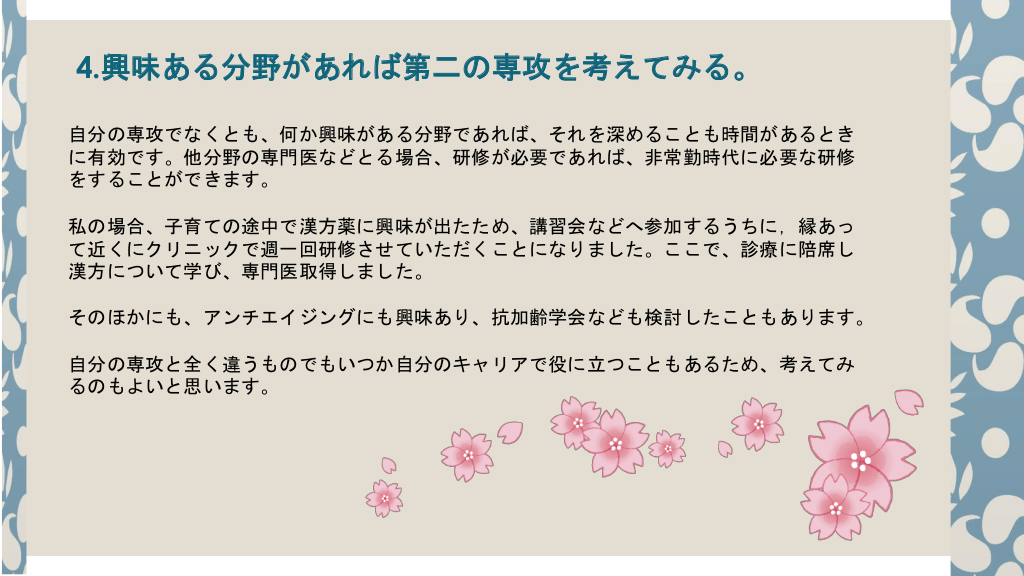 #22. 4.興味ある分野があれば第二の専攻を考えてみる。 自分の専攻でなくとも、何か興味がある分野であれば、それを深めることも時間があるとき に有効です。他分野の専門医などとる場合、研修が必要であれば、非常勤時代に必要な研修 をすることができます。 私の場合、子育ての途中で漢方薬に興味が出たため、講習会などへ参加するうちに,縁あっ て近くにクリニックで週一回研修させていただくことになりました。ここで、診療に陪席し 漢方について学び、専門医取得しました。 そのほかにも、アンチエイジングにも興味あり、抗加齢学会なども検討したこともあります。 自分の専攻と全く違うものでもいつか自分のキャリアで役に立つこともあるため、考えてみ るのもよいと思います。