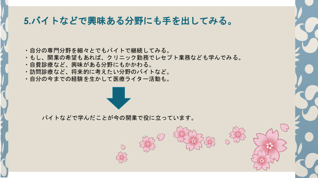 #23. 5.バイトなどで興味ある分野にも手を出してみる。 ・自分の専門分野を細々とでもバイトで継続してみる。 ・もし、開業の希望もあれば、クリニック勤務でレセプト業務なども学んでみる。 ・自費診療など、興味がある分野にもかかわる。 ・訪問診療など、将来的に考えたい分野のバイトなど。 ・自分の今までの経験を生かして医療ライター活動も。 バイトなどで学んだことが今の開業で役に立っています。