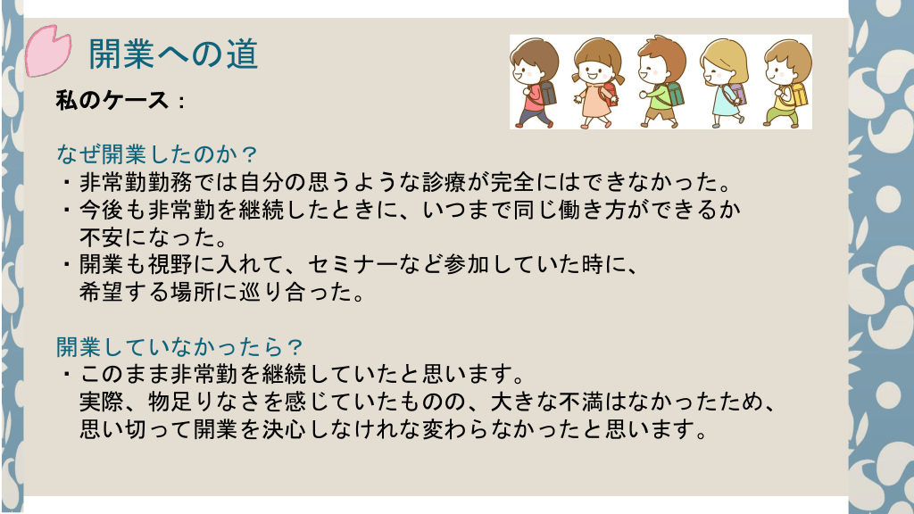 #24. 開業への道 私のケース: なぜ開業したのか? ・非常勤勤務では自分の思うような診療が完全にはできなかった。 ・今後も非常勤を継続したときに、いつまで同じ働き方ができるか 不安になった。 ・開業も視野に入れて、セミナーなど参加していた時に、 希望する場所に巡り合った。 開業していなかったら? ・このまま非常勤を継続していたと思います。 実際、物足りなさを感じていたものの、大きな不満はなかったため、 思い切って開業を決心しなけれな変わらなかったと思います。