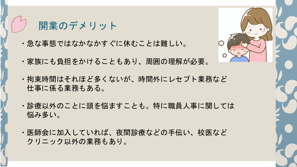 #26. 開業のデメリット ・急な事態ではなかなかすぐに休むことは難しい。 ・家族にも負担をかけることもあり、周囲の理解が必要。 ・拘束時間はそれほど多くないが、時間外にレセプト業務など 仕事に係る業務もある。 ・診療以外のことに頭を悩ますことも。特に職員人事に関しては 悩み多い。 ・医師会に加入していれば、夜間診療などの手伝い、校医など クリニック以外の業務もあり。