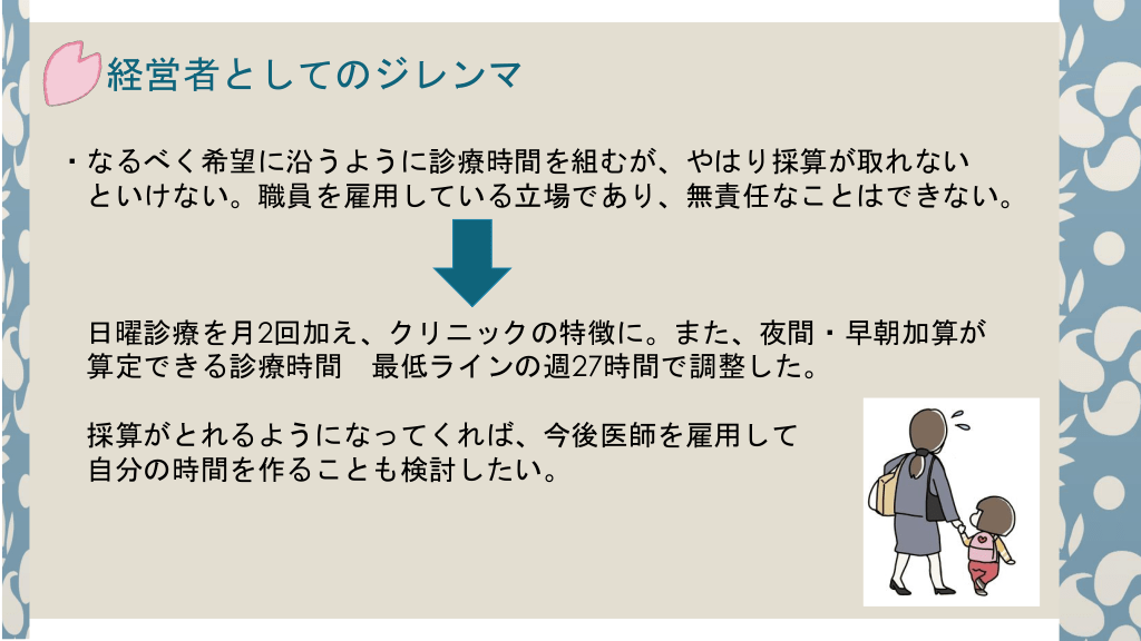 #28. 経営者としてのジレンマ ・なるべく希望に沿うように診療時間を組むが、やはり採算が取れない といけない。職員を雇用している立場であり、無責任なことはできない。 日曜診療を月2回加え、クリニックの特徴に。また、夜間・早朝加算が 算定できる診療時間 最低ラインの週27時間で調整した。 採算がとれるようになってくれば、今後医師を雇用して 自分の時間を作ることも検討したい。