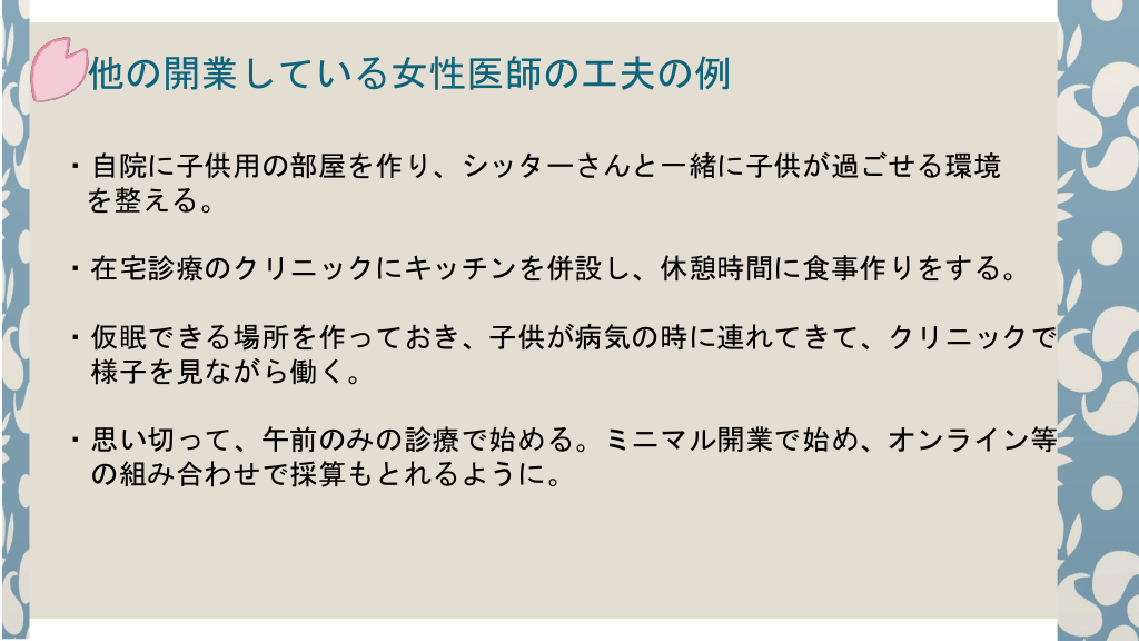 #29. 他の開業している女性医師の工夫の例 ・自院に子供用の部屋を作り、シッターさんと一緒に子供が過ごせる環境 を整える。 ・在宅診療のクリニックにキッチンを併設し、休憩時間に食事作りをする。 ・仮眠できる場所を作っておき、子供が病気の時に連れてきて、クリニックで 様子を見ながら働く。 ・思い切って、午前のみの診療で始める。ミニマル開業で始め、オンライン等 の組み合わせで採算もとれるように。