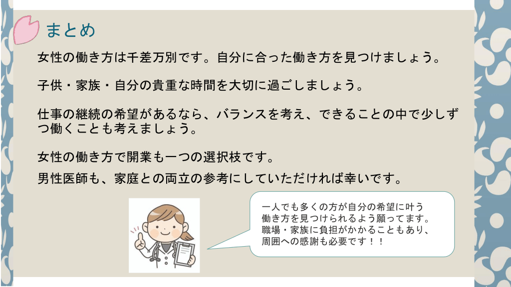 #30. まとめ 女性の働き方は千差万別です。自分に合った働き方を見つけましょう。 子供・家族・自分の貴重な時間を大切に過ごしましょう。 仕事の継続の希望があるなら、バランスを考え、できることの中で少しず つ働くことも考えましょう。 女性の働き方で開業も一つの選択枝です。 男性医師も、家庭との両立の参考にしていただければ幸いです。 一人でも多くの方が自分の希望に叶う 働き方を見つけられるよう願ってます。 職場・家族に負担がかかることもあり、 周囲への感謝も必要です!!