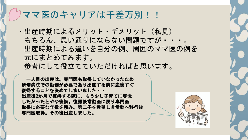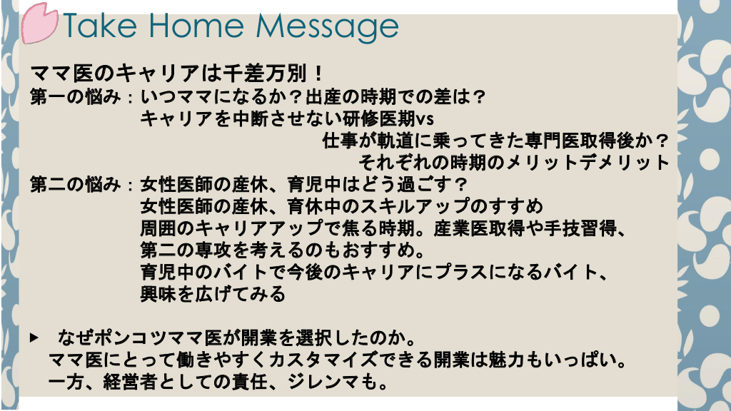 #4. Take Home Message ママ医のキャリアは千差万別! 第一の悩み:いつママになるか?出産の時期での差は? キャリアを中断させない研修医期vs 仕事が軌道に乗ってきた専門医取得後か? それぞれの時期のメリットデメリット 第二の悩み:女性医師の産休、育児中はどう過ごす? 女性医師の産休、育休中のスキルアップのすすめ 周囲のキャリアアップで焦る時期。産業医取得や手技習得、 第二の専攻を考えるのもおすすめ。 育児中のバイトで今後のキャリアにプラスになるバイト、 興味を広げてみる ▶ なぜポンコツママ医が開業を選択したのか。 ママ医にとって働きやすくカスタマイズできる開業は魅力もいっぱい。 一方、経営者としての責任、ジレンマも。