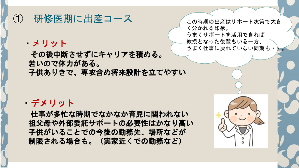 #6. ① 研修医期に出産コース ・メリット その後中断させずにキャリアを積める。 若いので体力がある。 子供ありきで、専攻含め将来設計を立てやすい この時期の出産はサポート次第で大き く分かれる印象。 うまくサポートを活用できれば 教授となった後輩もいる一方、 うまく仕事に戻れていない同期も・・。 ・デメリット 仕事が多忙な時期でなかなか育児に関われない 祖父母や外部委託サポートの必要性はかなり高い 子供がいることでの今後の勤務先、場所などが 制限される場合も。(実家近くでの勤務など)